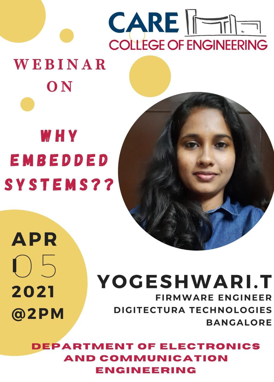 Embedded systems are one of the most highly paid jobs. Embedded engineers are currently in high demand. To give exposure about the embedded systems, Department of Electronics and Communication Engineering organized an Online Webinar on “‘WHY EMBEDDED SYSTEMS” on 5/4/2021 and expert from Yogeshwari.T, Firmware Engineer, Digitectura technologies Bangalore. She gave wonderful talk from basic to current technologies in which they working on. And also motivated the student to work in it. At last she concluded with that “There is no doubt that once you obtain experience of 3-4 years, you will get attractive packages and also experienced Embedded System developers have extremely high demand in India. It was a very fruitful session for the students.
