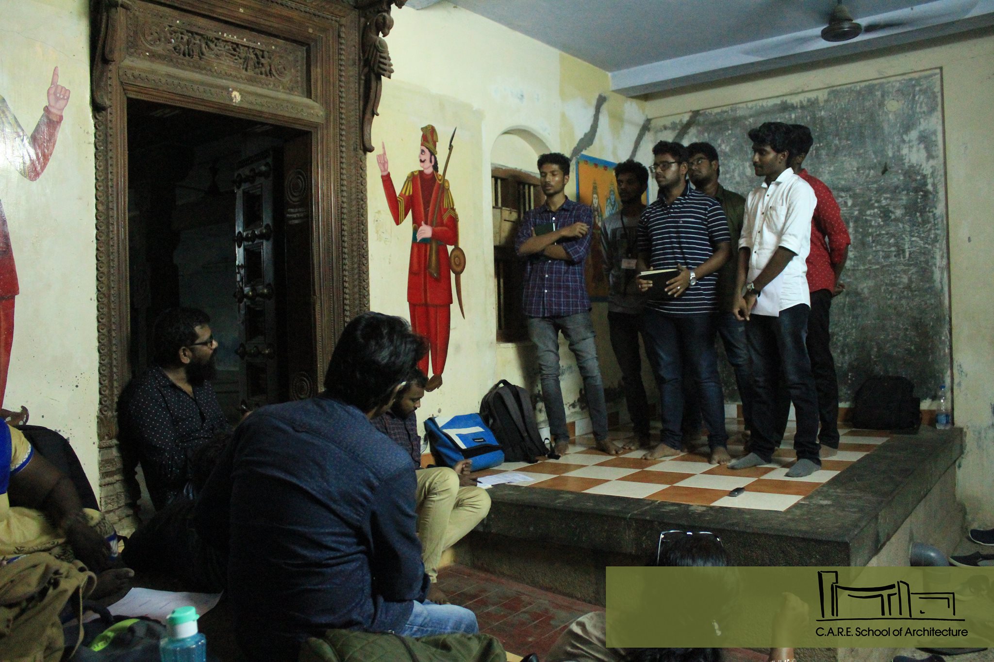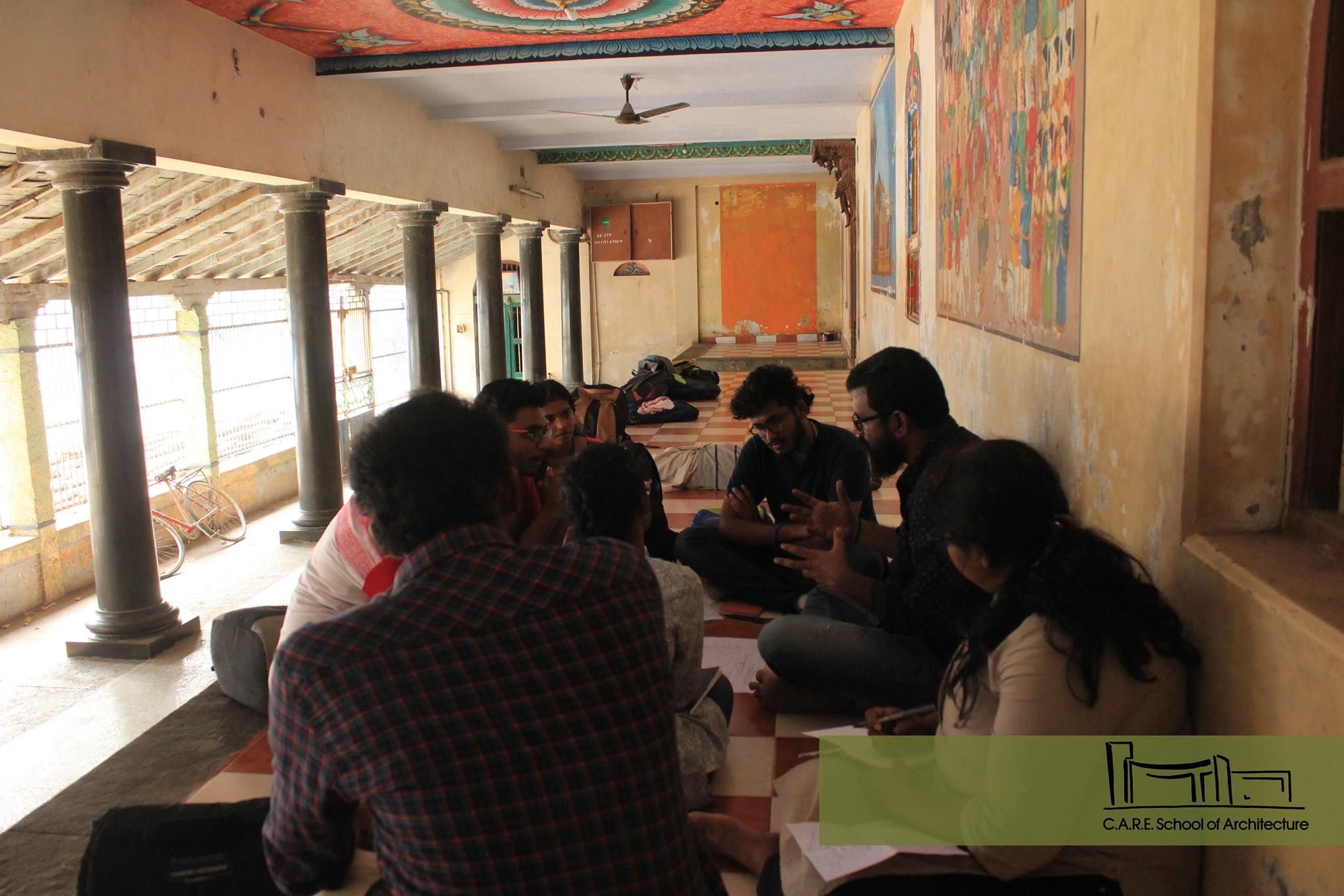 The school is apart of a conglomerate,CCF,with Avani Institute of Design,Calicut,School Of Environment and Architecture,Mumbai, Wadiyar Centre for Architecture,Mysore,as other constituent members.This conglomerate was formed with an intent to establish potent learning networks amongst schools offering Architectural education and to share expertise and Resources for enhanced learning. As an Initial step towards this collaboration a two week long studio programme on the underlying theme of “Care and Connectedness” is on between the 4th and 16th of February amongst the four schools. We at CARE are working on on probing the ontological question of what is learning and what is an ideal learning environments. In the context of Trichy,A place that is littered with temple settlements of varying scales and many with inherent craft traditions, where on a daily basis learning happens intutively by just dwelling or being as against structured formal schooling that one often associates with learning.