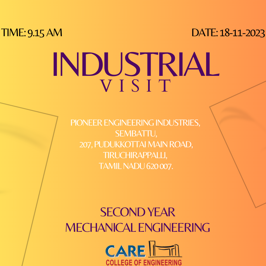 The Department of Mechanical Engineering intends to take II Year Mechanical Engineering students on an industrial visit to Pioneer Engineering Industries, Trichy, on November 18, 2023.
