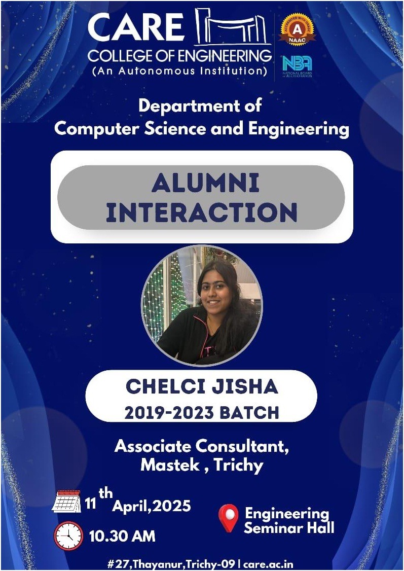 We, department of Computer Science and Engineering has organized an alumni interaction program for III year CSE students on 11.04.2025 from 11.00 AM to 12.30 PM. Ms. Chelci Jisha, 2019-2023 batch, CSE department accepted our invitation and acted as a speaker. Ms. Chelci Jisha is now working as Associate Consultant-II, Mastek , Trichy