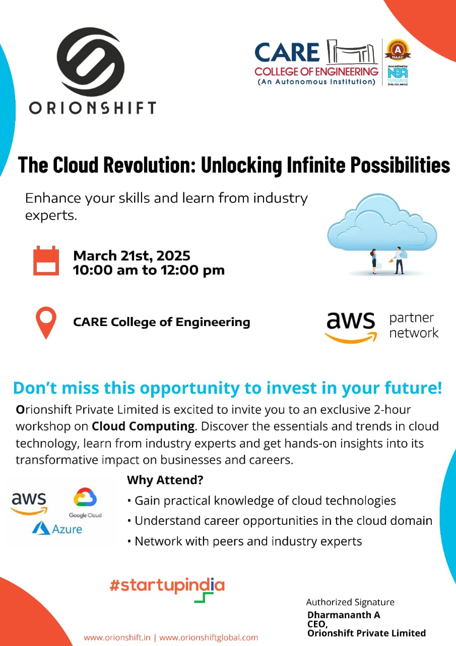 An Industry Interaction Program was organized for 3rd year Computer Science and Engineering (CSE) students in collaboration with Orionshift Pvt. Ltd on March 21 2025. The session focused on the subject Cloud Computing, with an emphasis on Amazon Web Services (AWS).