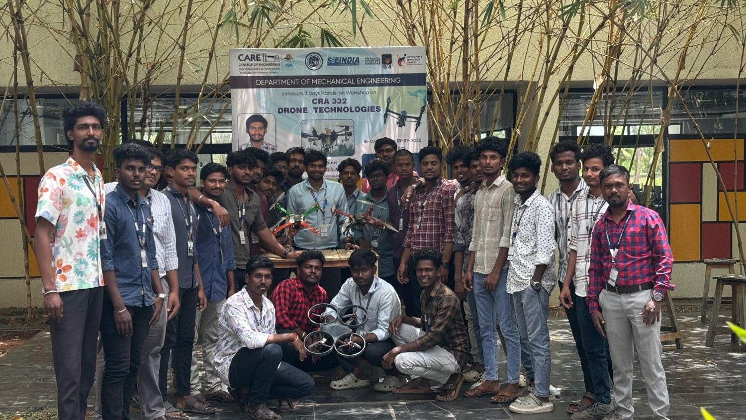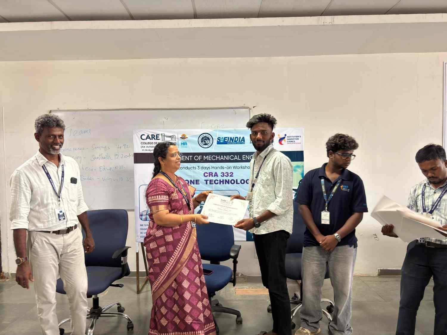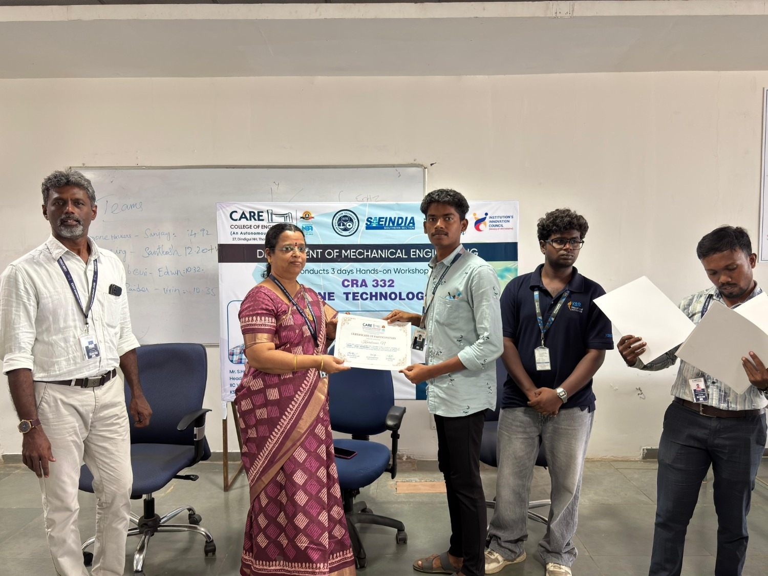 The Department of Mechanical Engineering successfully organized a three-day hands-on workshop on CRA332 – Drone Technologies from 16th to 18th July 2025 at CARE College of Engineering. The event was specifically tailored for final-year students from the Mechanical and Civil Engineering departments, aiming to provide comprehensive knowledge and practical exposure to drone systems and operations.