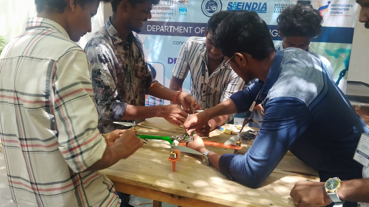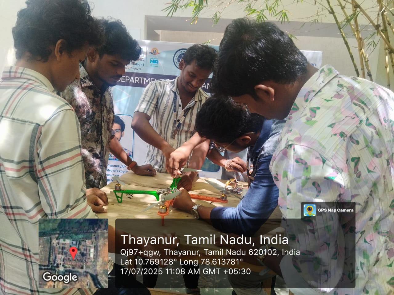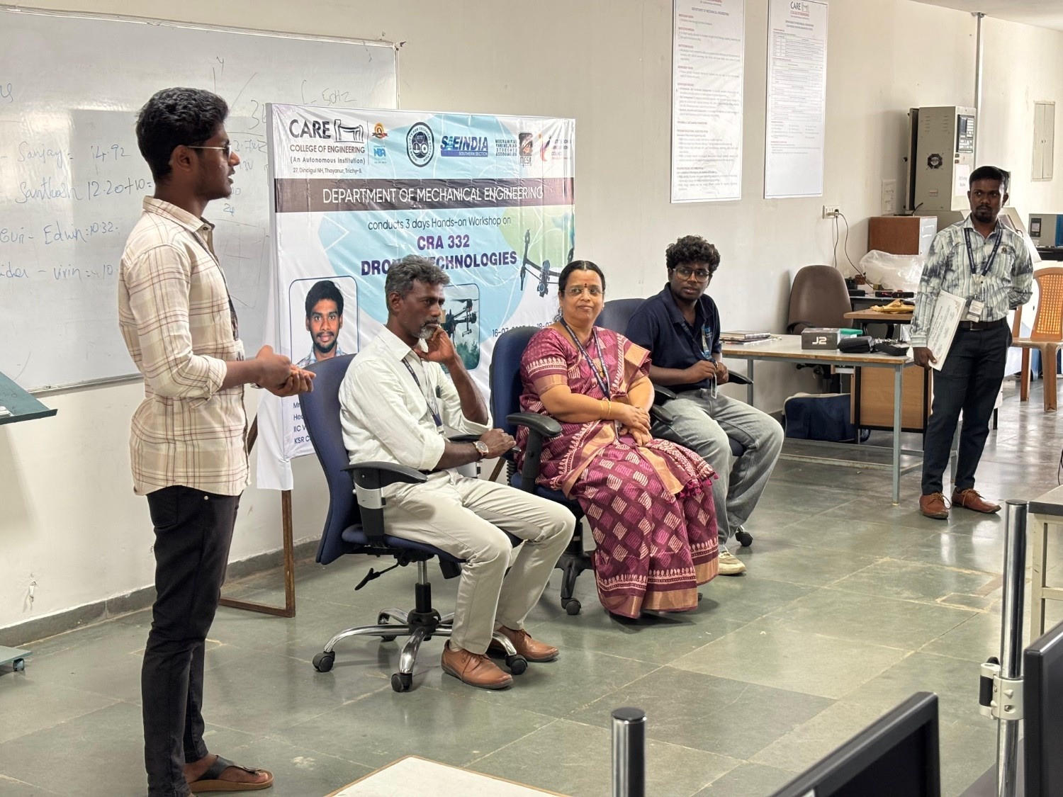 The Department of Mechanical Engineering successfully organized a three-day hands-on workshop on CRA332 – Drone Technologies from 16th to 18th July 2025 at CARE College of Engineering. The event was specifically tailored for final-year students from the Mechanical and Civil Engineering departments, aiming to provide comprehensive knowledge and practical exposure to drone systems and operations.
