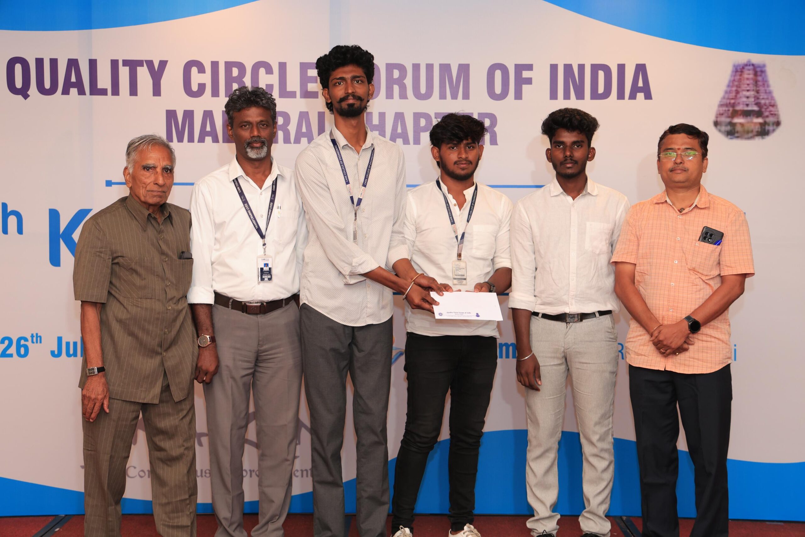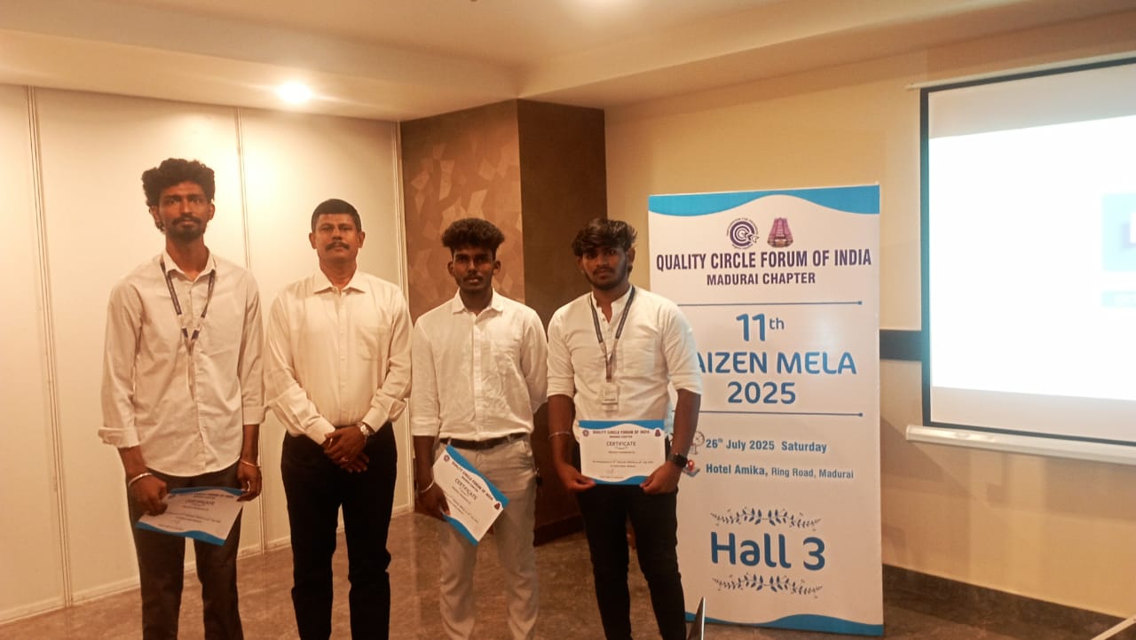 A team of final year students successfully participated and presented in the 11th Kaizen Mela 2025, organized by the Quality Circle Forum of India (QCFI), Madurai Chapter. The Kaizen Mela serves as a platform for showcasing continuous improvement initiatives and fosters a culture of innovation across industries and educational institutions. The event witnessed the enthusiastic participation of around 25 leading companies, including TVS Srichakra, JK Fenner, RBL Trichy, SRF Trichy, and TAFE Factory Madurai, among others.And It is a matter of pride that our institute was the only educational institution to participate in this event