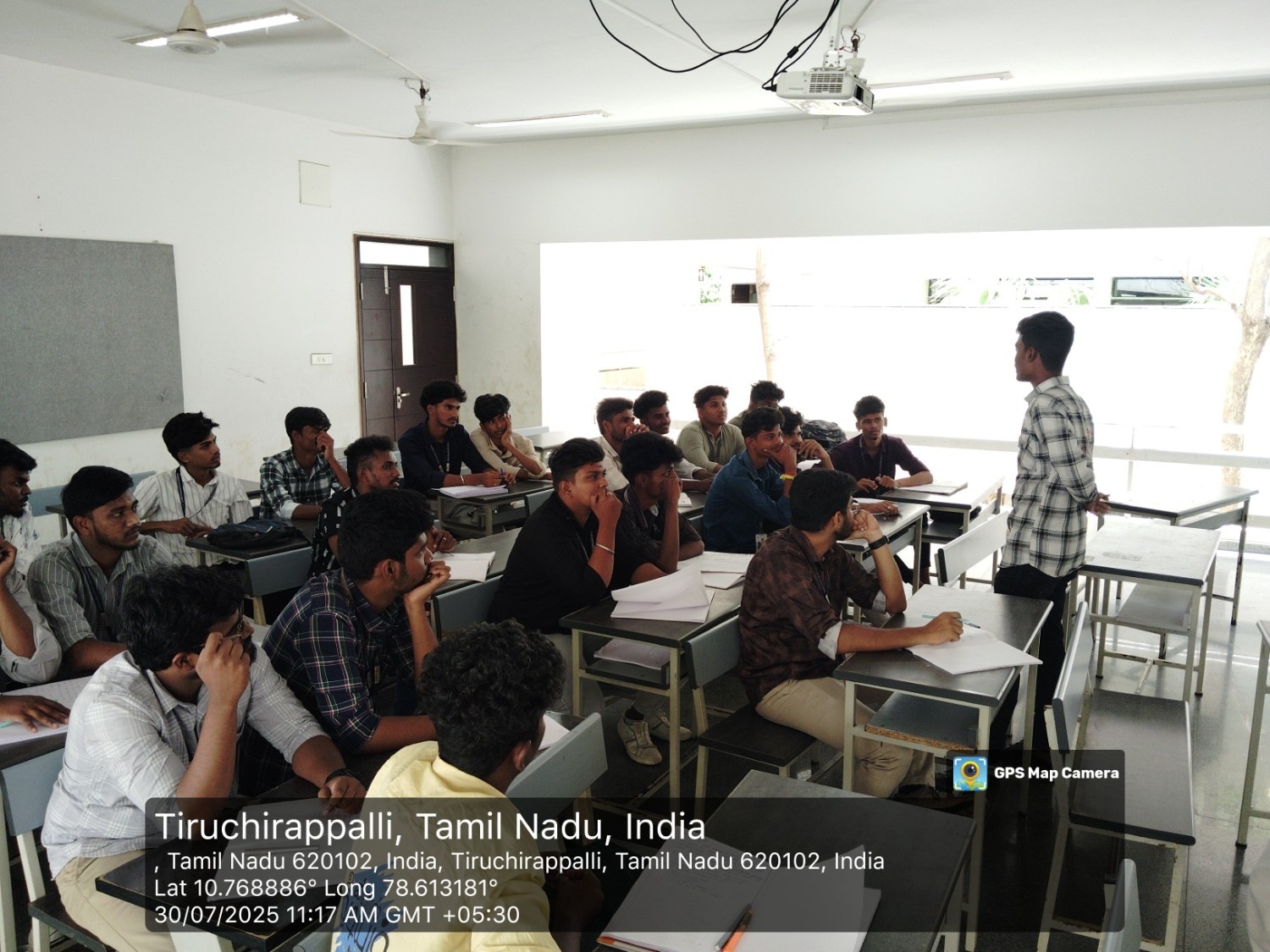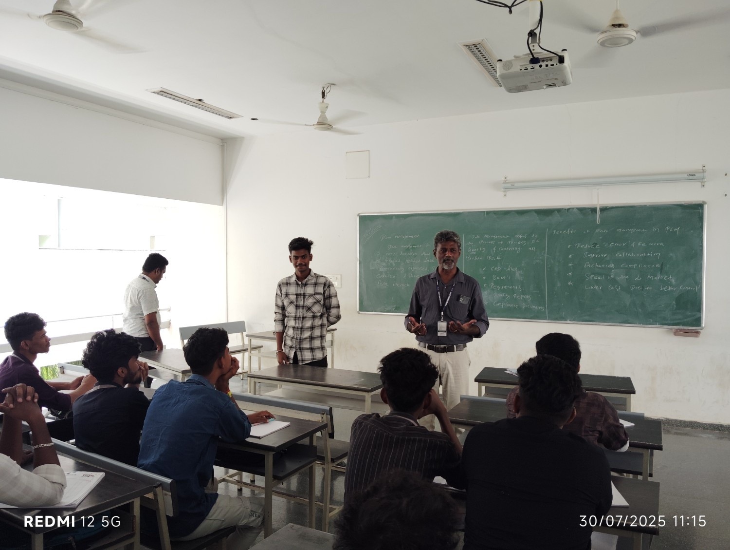 Mr. K. Kalimuthu, an alumnus from the 2021–2025 batch and currently employed as a Site Engineer at Grace Air Conditioner, Trichy, shared his personal and professional journey. He offered students a clear view of the transition from college life to the corporate environment.