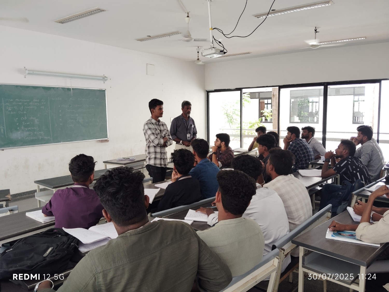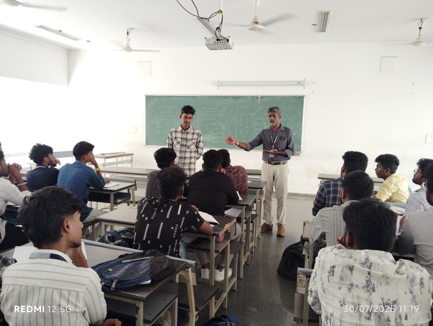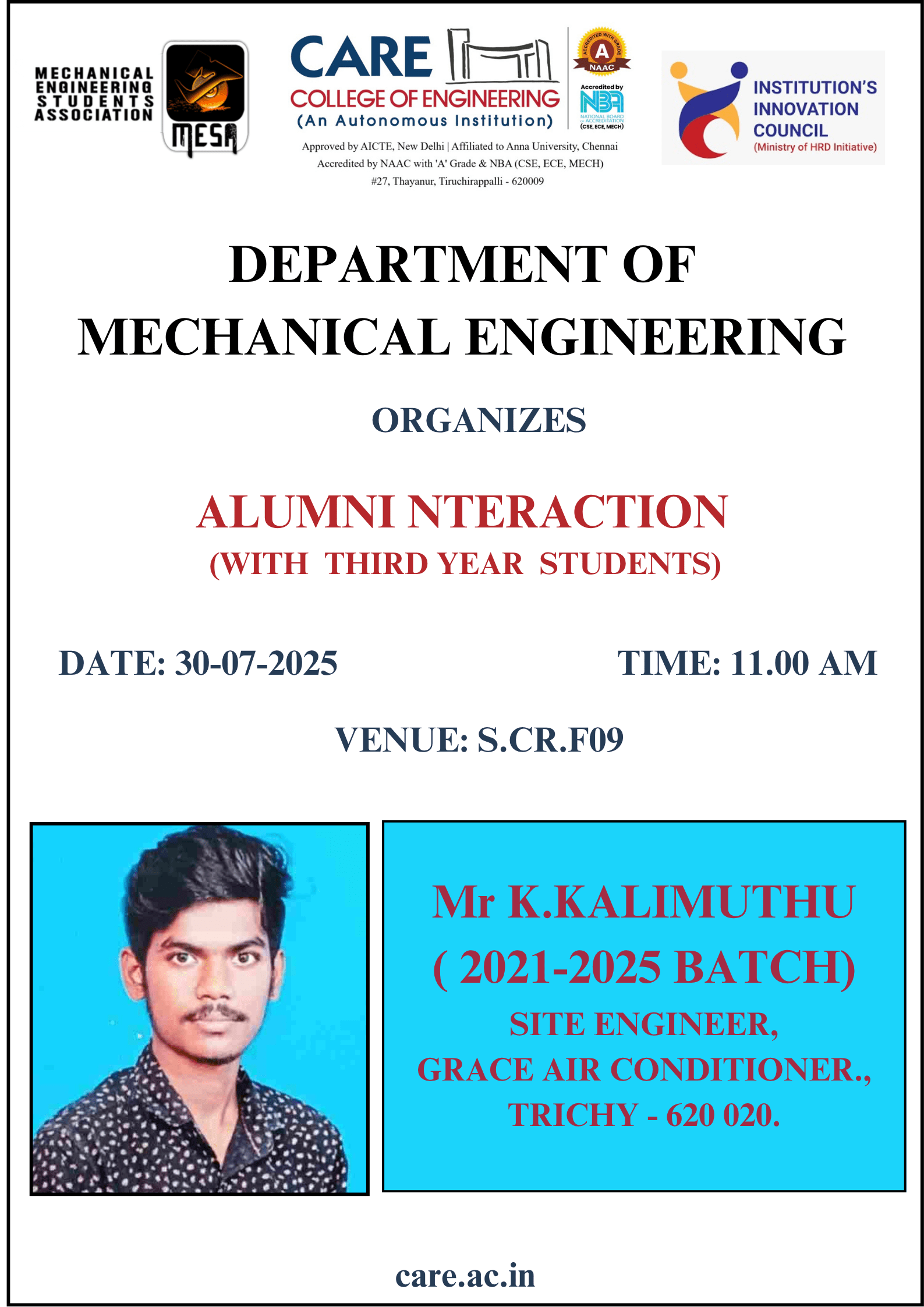 The Department of Mechanical Engineering, CARE College of Engineering, organized an Alumni Interaction Session on 30th July 2025 for third-year Mechanical Engineering students. The session aimed to connect students with industry experiences through insights shared by a recent alumnus, helping them better understand workplace expectations and career development pathways.