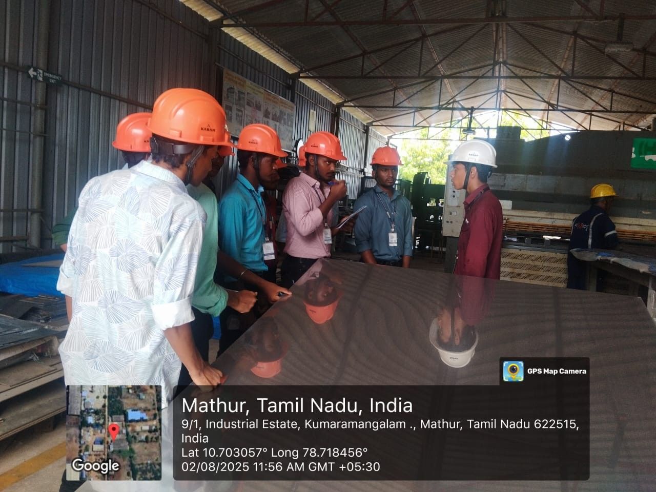The program commenced with a Safety Orientation session by Mr. Rajesh, Manager, where students were briefed on safety measures and protocols essential for industrial environments. This was followed by a Corporate Presentation by Mr. S.R. Surya, Manager, providing an overview of the company’s operations, products, and market approach. Post a short break, students were divided into three teams for the shop floor visit led by Mr. Madhudeepan (Dy. Manager), Mr. Joel (Engineer), and Mr. Ashik (Engineer).During the visit, the teams observed various manufacturing processes, including pressure vessels, heat exchangers, and control valve manufacturing, along with operational workflows, gaining valuable insights into lean tools such as 5S and Kaizen in action.After lunch, a session on Lean Management was conducted by Mr. Gowtham, Sr. Manager, where concepts of waste reduction and productivity improvement were discussed. This was followed by feedback and an industry overview by Mrs. Pavithra, HR/Head, who highlighted career opportunities, skill requirements, and the company’s vision for future growth.Finally, the program concluded with an interactive discussion, a group photograph with the company’s employees, and a vote of thanks delivered by Mr. A. Antony Luki M.E., (Ph.D.), Assistant Professor. Special thanks to Mrs. S. Saraswathi PA to the Principal, CARE College Of Engineering for her reference to the industry. his one-day industrial exposure provided students with a better understanding of mechanical systems, workplace safety, and problem-solving approaches, inspiring them to integrate these learnings into their academic projects and future professional endeavors.