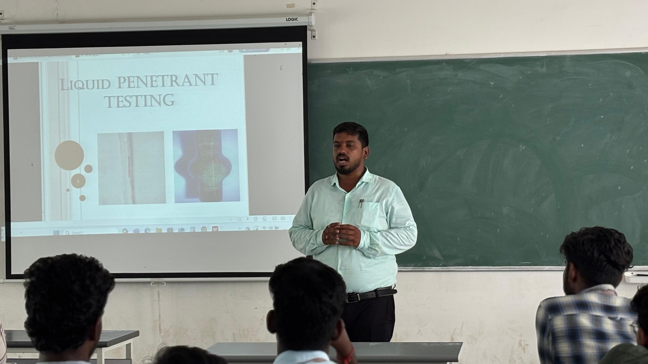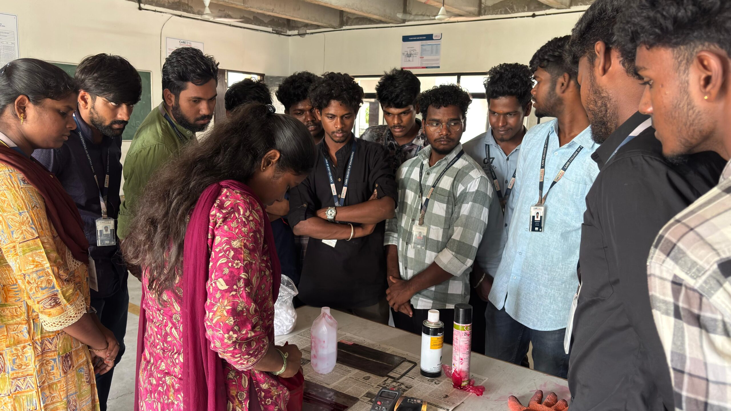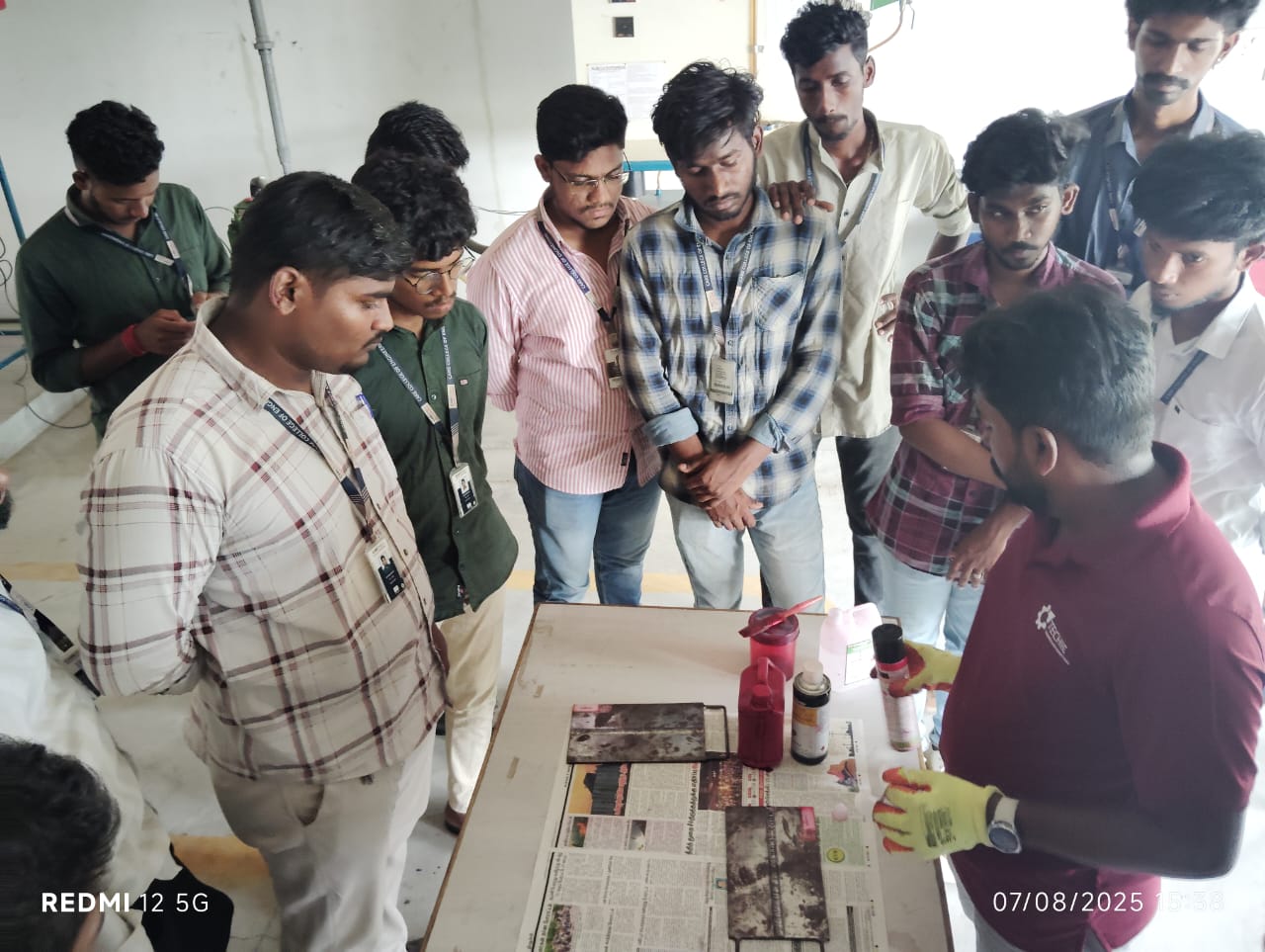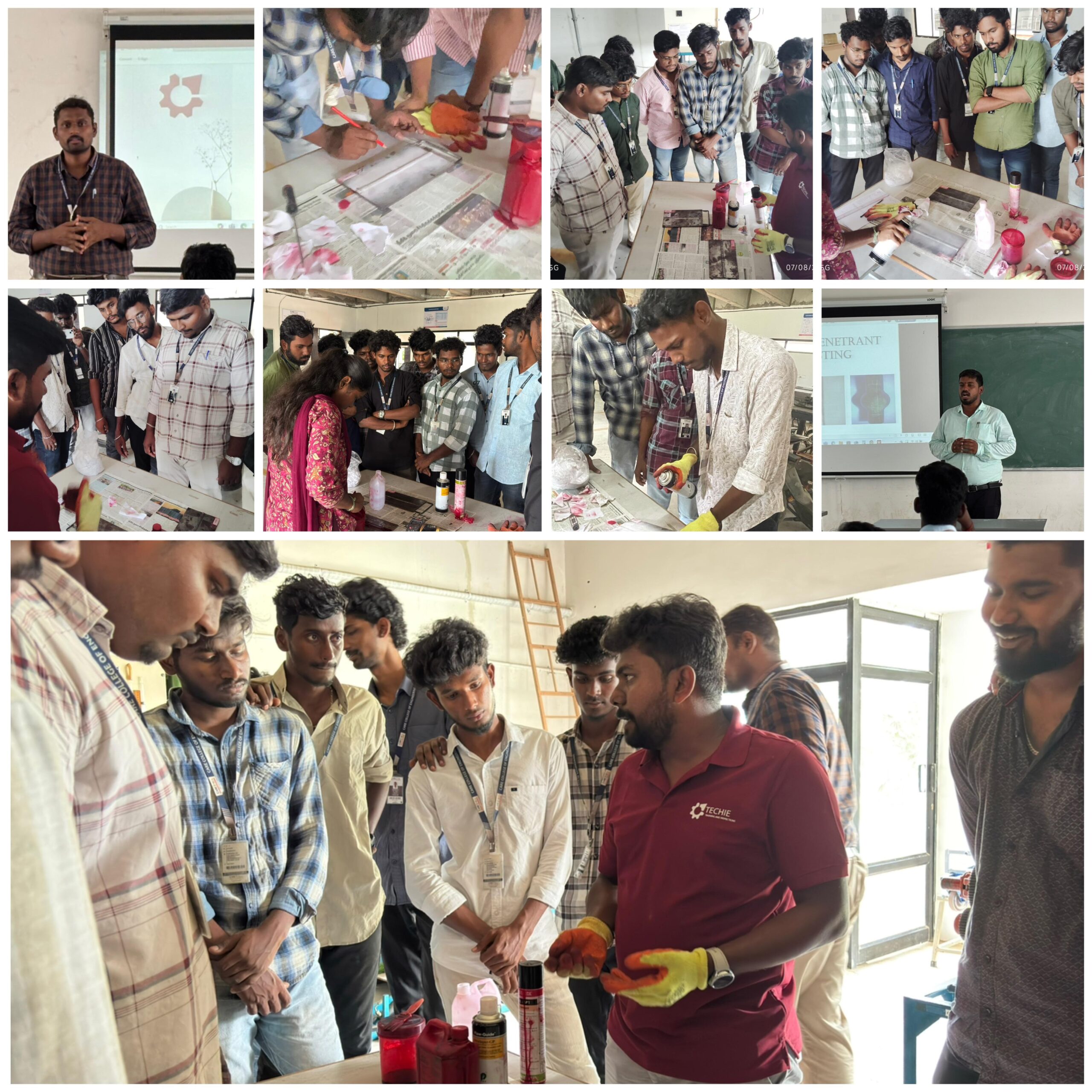 Mr. Madeswaran conducted a thorough and comprehensive session on the LPI method, detailing its principles and various applications. Following the theoretical discourse, students were given a dedicated hands-on session where they individually practised the LPI application. This practical component included identifying discontinuities in test materials and preparing professional reports, a crucial skill in the field. The students actively engaged with the resource person, asking a variety of interactive questions that enriched the learning experience and demonstrated their keen interest in the subject.