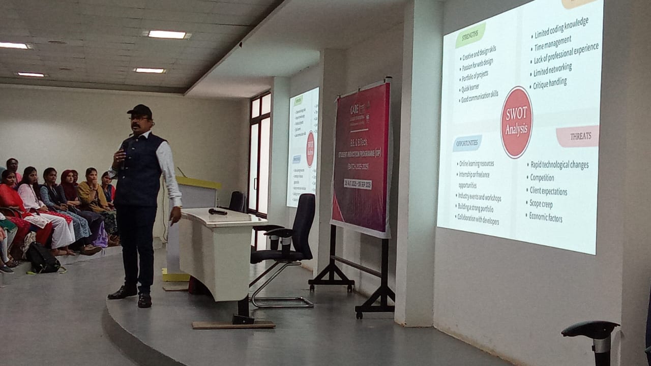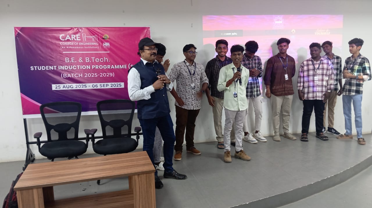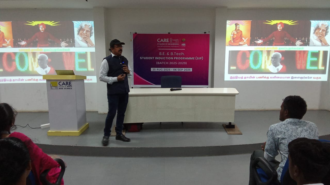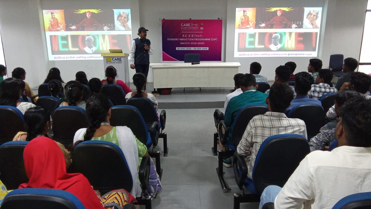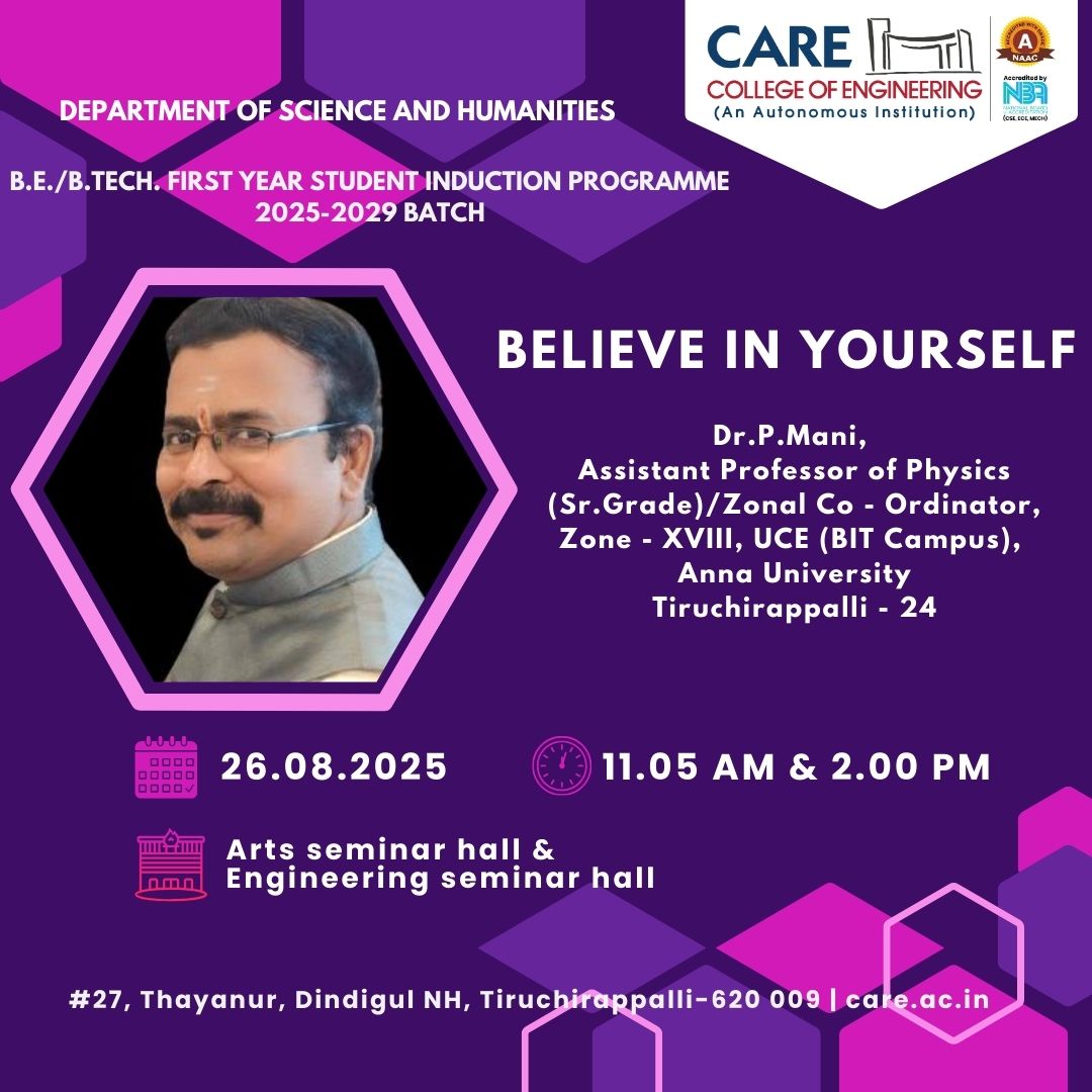 A session on “Believe in Yourself” was conducted on 26/08/2025 for the first year students at CARE College of Engineering, by Dr. P.Mani, Assistant Professor of Physics (Sr. Grade) / Zonal Coordinator, Anna University, BIT Campus, Trichy. He inspired students with stories of legends like Dr. A.P.J. Abdul Kalam and emphasized self-belief through SWOT analysis to know one’s strengths, weaknesses, opportunities, and threats. He also highlighted how friends, thoughts, and self-awareness contribute to employability skills. The session was highly motivating and insightful.
