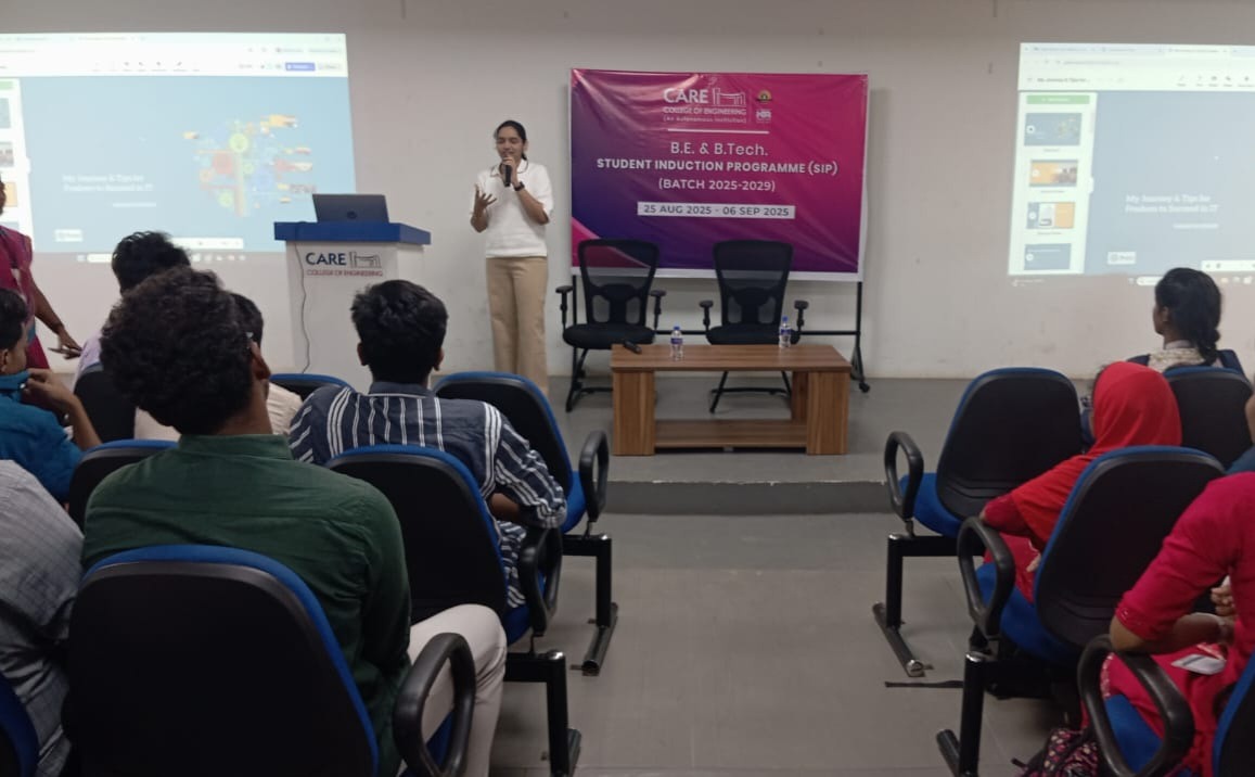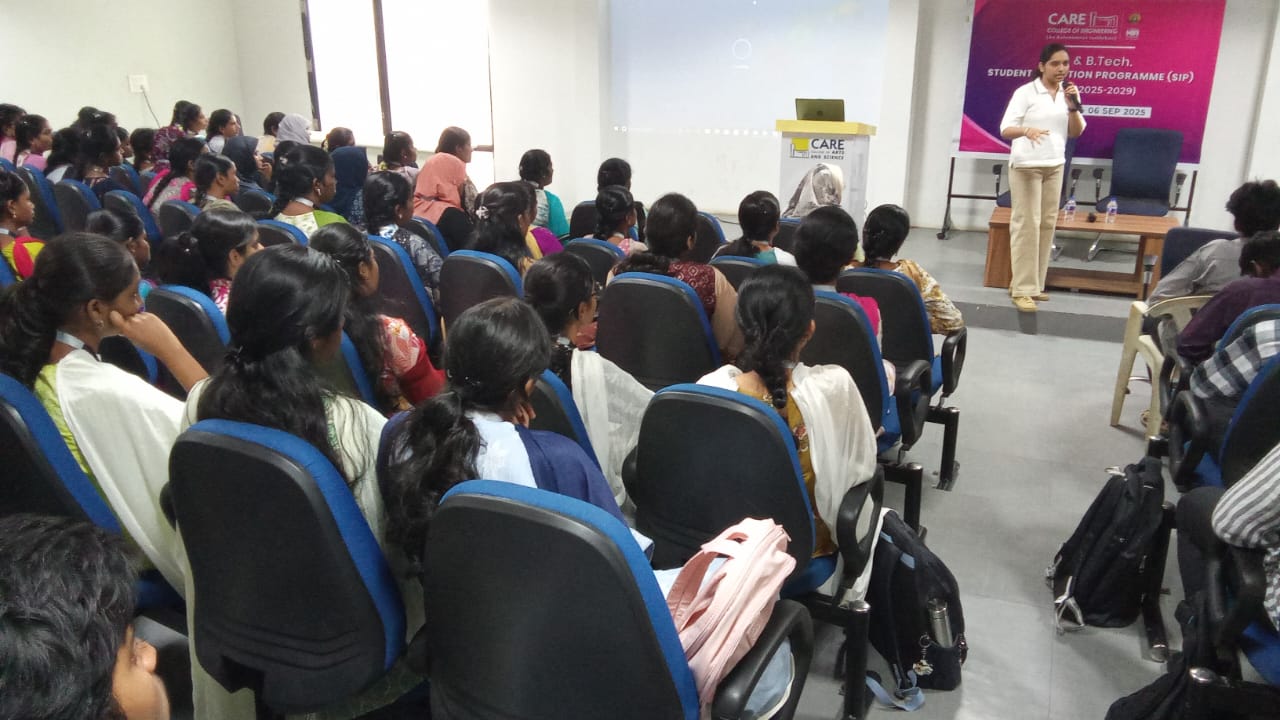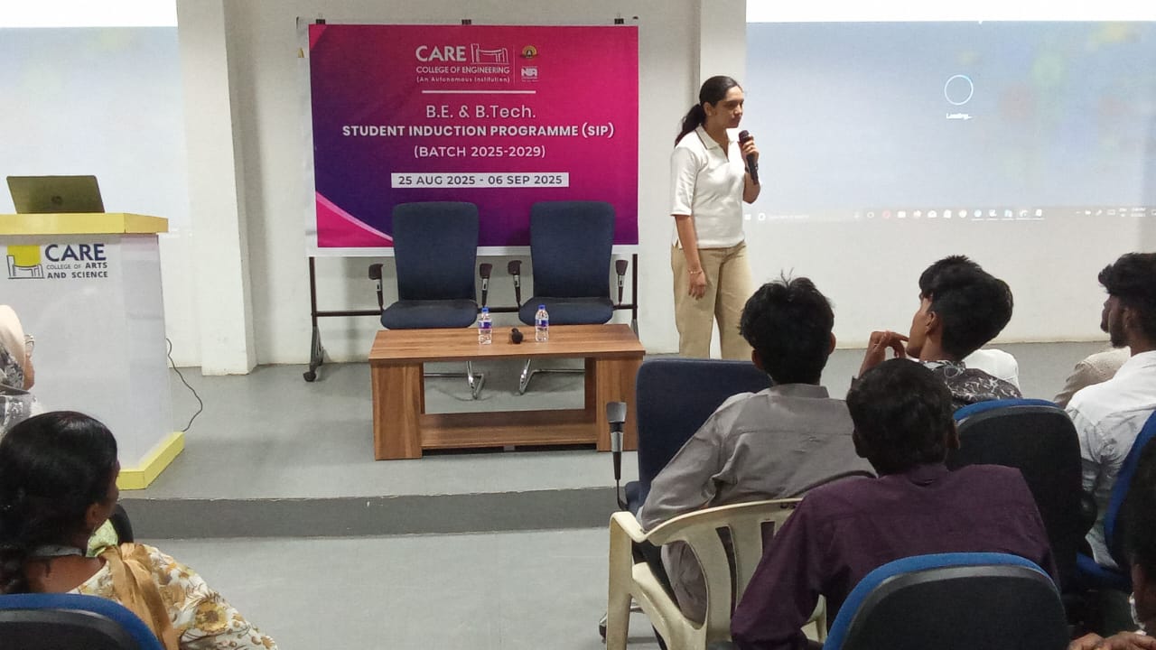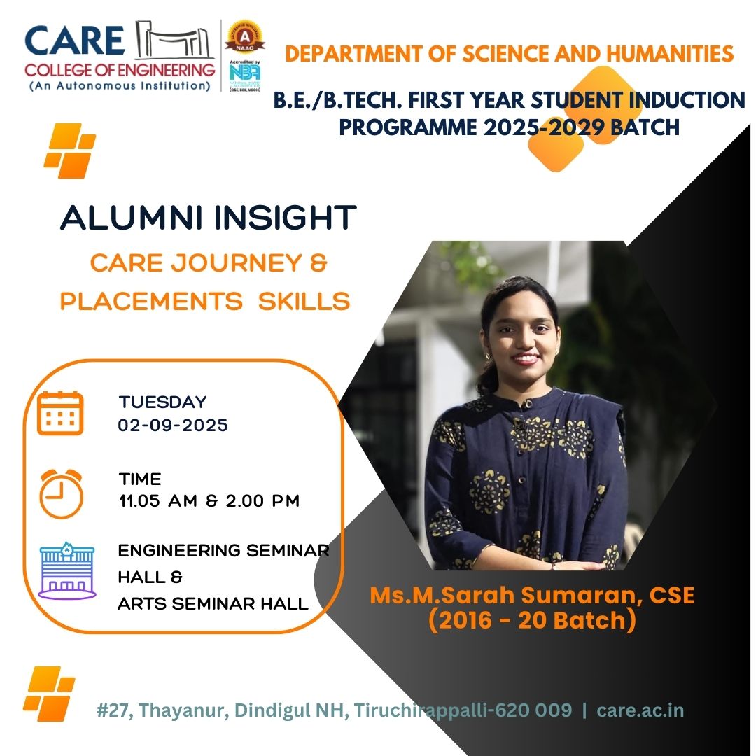 The Department of S& H organized an Alumni Insight session on “CARE Journey & Skills to be acquired for good Placements in MNCs like Accenture TCS,CTS etc.”on 02/09/2025. Alumna Ms. M. Sarah Sumran, CSE (2016–2020 Batch) was the chief guest.She shared her CARE journey and stressed the importance of coding, aptitude, communication skills, and adaptability for placements in MNCs. She also informed the students that an overall development is essential which should be acquired during their college life itself. The session was interactive and motivated students to prepare effectively for their careers.