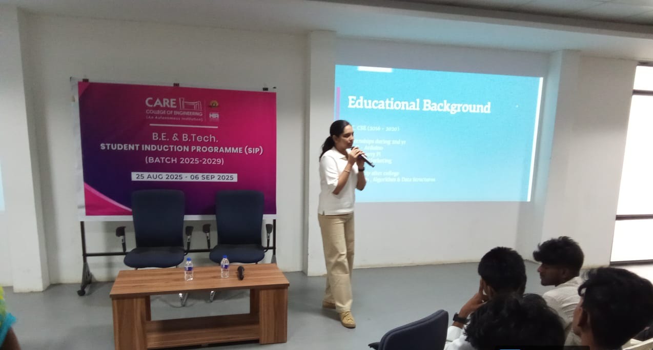 The Department of S& H organized an Alumni Insight session on “CARE Journey & Skills to be acquired for good Placements in MNCs like Accenture TCS,CTS etc.”on 02/09/2025. Alumna Ms. M. Sarah Sumran, CSE (2016–2020 Batch) was the chief guest.She shared her CARE journey and stressed the importance of coding, aptitude, communication skills, and adaptability for placements in MNCs. She also informed the students that an overall development is essential which should be acquired during their college life itself. The session was interactive and motivated students to prepare effectively for their careers.