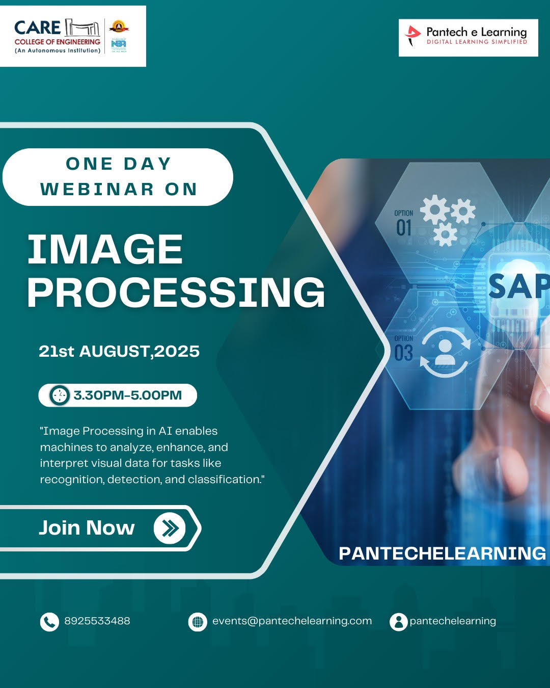 The webinar on “Image processing in AI” was organized for III year ECE Students in association with pantench E learning on 21.8.2025 from 3.30 p.m to 5.00 p.m through a youtube live session. The webinar aims to introduce and explore the applications of Image Processing in Artificial Intelligence. The session focuses on how Image processing in AI can: