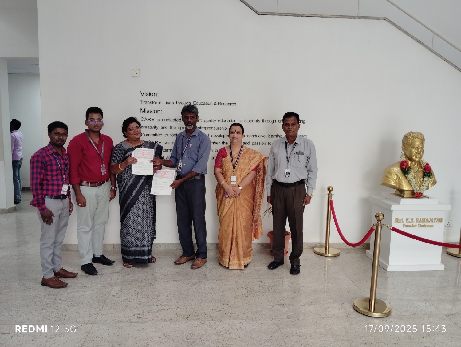 The program also featured a special address by Dr. S. Shanthi, Principal of CARE College of Engineering, who underlined the importance of such collaborations in enhancing students’ technical exposure and professional development. Adding further value, Dr. K. Kannan, Dean of Academics, CARE College of Engineering, actively participated in the discussions, reinforcing the institution’s commitment to industry partnerships. The formal proceedings concluded with a heartfelt vote of thanks by Mr. A. Antony Luki, Assistant Professor of Mechanical Engineering, who acknowledged the contributions of both the management and the industry delegates for making the occasion successful. The event came to a close with group photographs taken in front of the administrative office, marking a memorable beginning of a long-term partnership that will open avenues for student internships, technical training, and collaborative activities under the newly signed MoU.