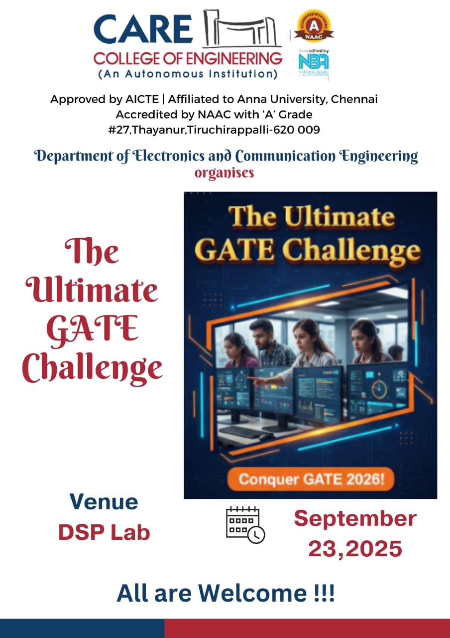The Department of Electronics and Communication Engineering of CARE College of Engineering organized “The Ultimate GATE Challenge” on September 23, 2025, at the DSP Lab. The event witnessed enthusiastic participation from third-year ECE students, who appeared for a GATE-style mock test designed to evaluate their conceptual understanding and analytical skills in core ECE subjects.