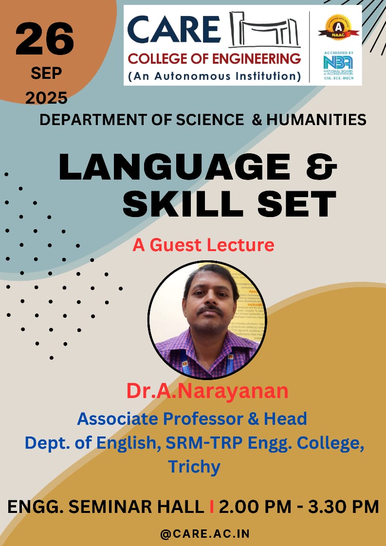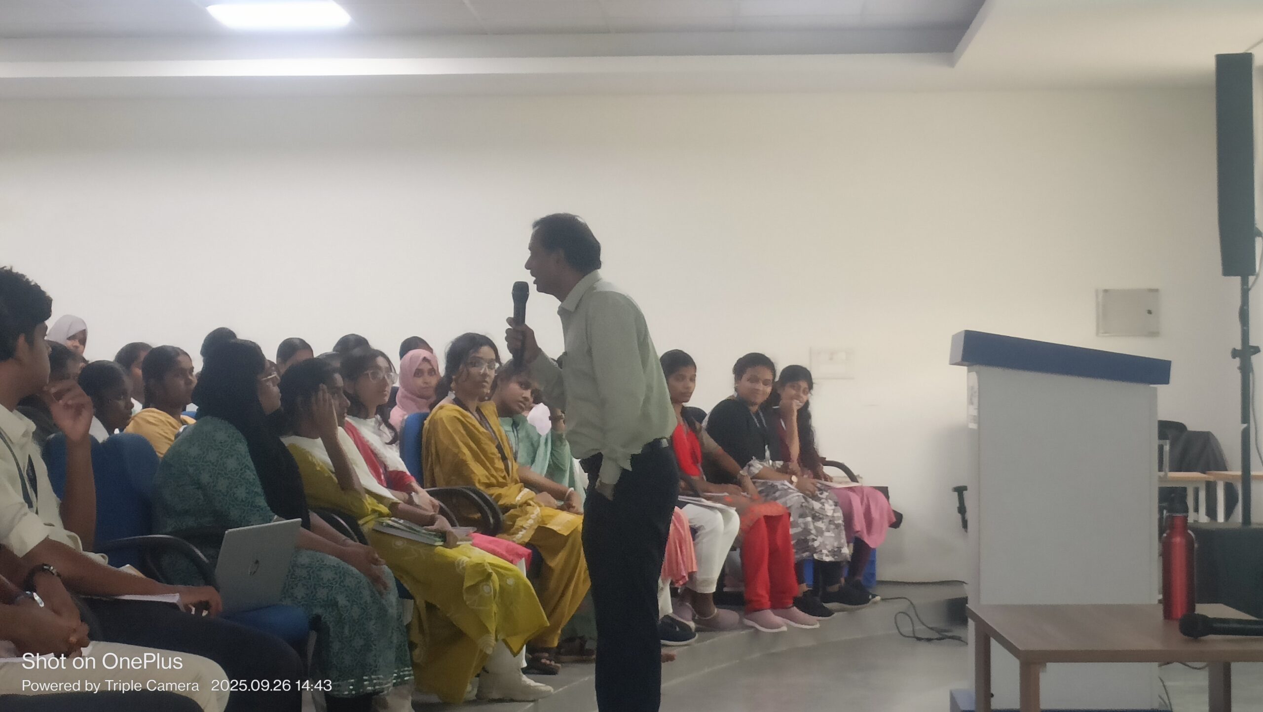 The Department of Science and Humanities organized an insightful guest lecture on the pivotal topic of “Language and Skill Set” on 26/09/25 between 2.00 and 3.30 P.M.She warmly welcomed the esteemed guest speaker, the faculty members, and all the students.