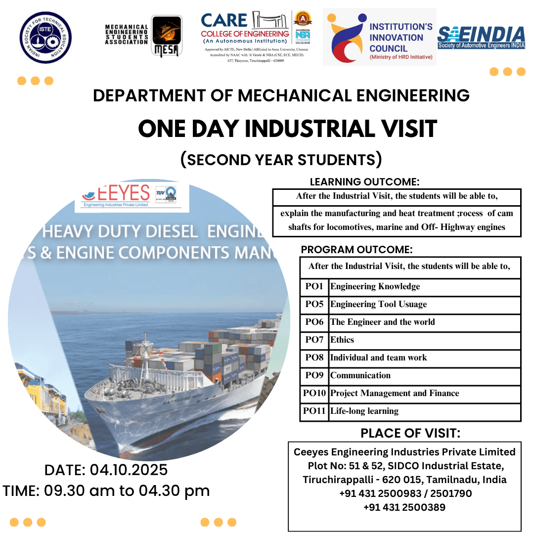 The Department of Mechanical Engineering, CARE College of Engineering, Tiruchirappalli, organized a one-day industrial visit to CEE YES ENGINEERING INDUSTRIES PRIVATE LIMITED on 04th October 2025 for the 25 second-year Mechanical Engineering students. The visit was convened by Dr. D. R. Rajkumar, Professor & Head, Department of Mechanical Engineering, and coordinated by Mr. V. Venkatesan, Assistant Professor / Mechanical.