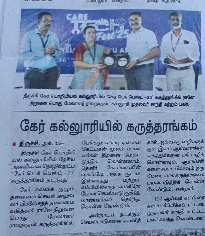 CARE Tech Fest ’25, held on 16th October 2025 at CARE College of Engineering, is a vibrant intercollegiate technical festival celebrating innovation, creativity, and technical excellence. The event features paper presentations, project expos, and various technical challenges, providing a platform for students to showcase their skills and innovative ideas.