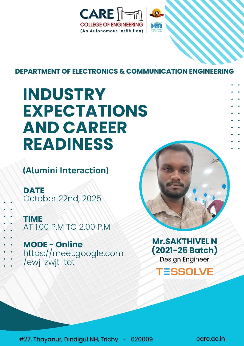 The Department of Electronics and Communication Engineering organized an Alumni Interaction session on “Industry Expectations and Career Readiness” on 22nd October 2025 in online mode. The session was delivered by Mr. Sakthivel N (2021–25 Batch), Design Engineer at Tessolve, who shared valuable insights on current industry trends, essential technical and soft skills, and strategies to enhance employability. The session provided students with a clear understanding of industry expectations and guided them on preparing effectively for their career paths. The interactive nature of the session enabled students to clarify their doubts and gain practical perspectives, making it a highly beneficial and enriching experience.