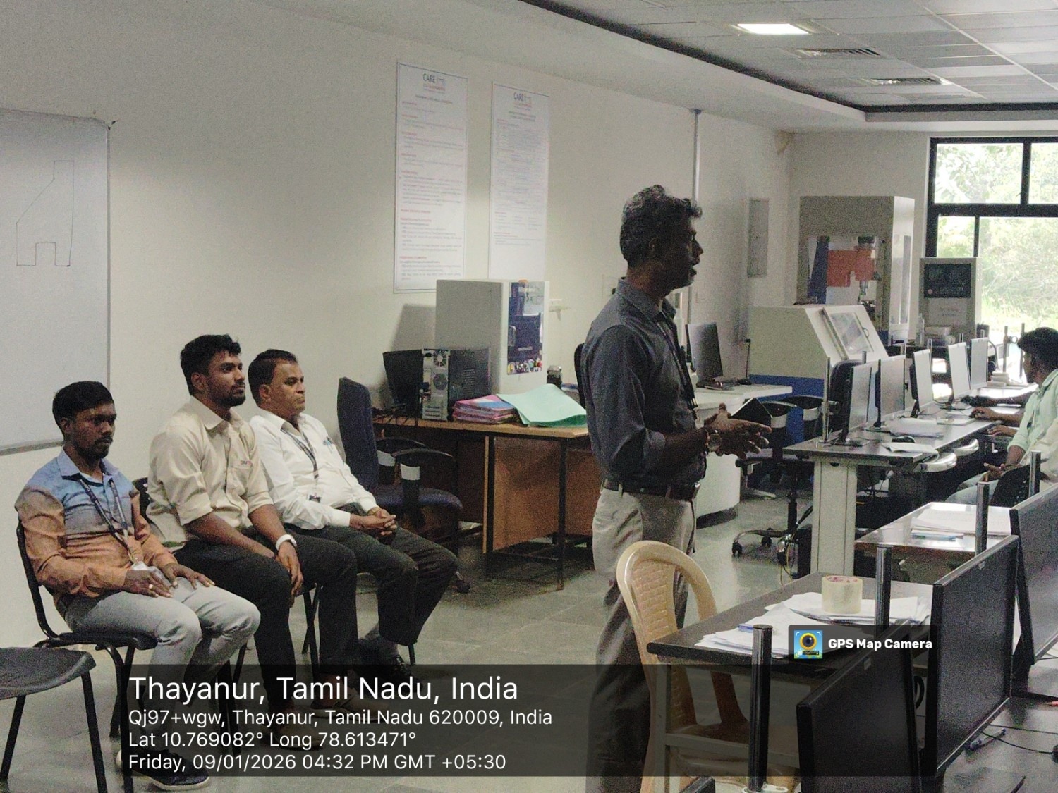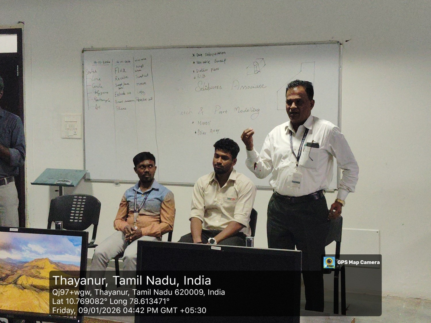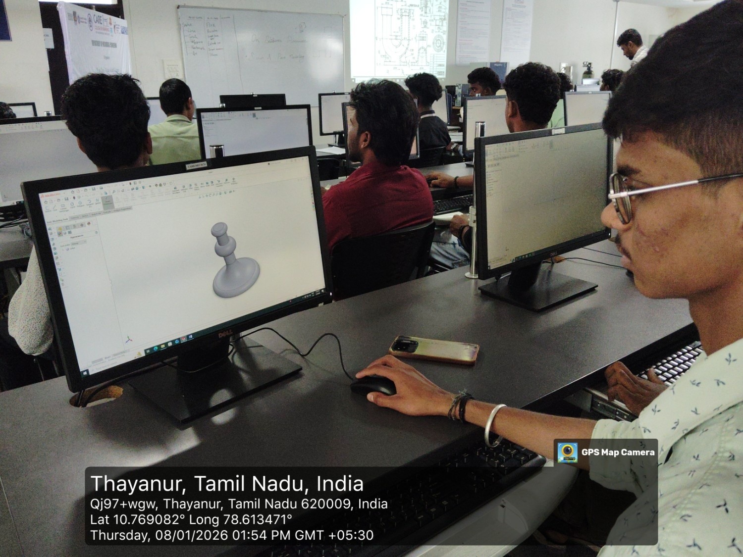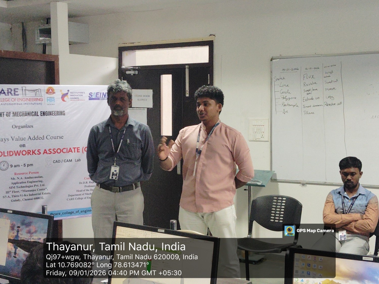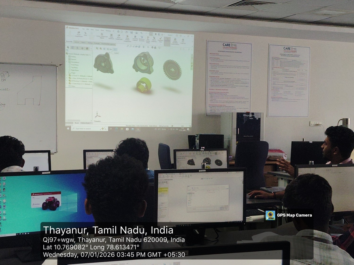 The Department of Mechanical Engineering, CARE College of Engineering, organized a Five Days Value Added Course on “Certificate on Solid Works Associate (CSWA)” from 05.01.2026 to 09.01.2026 at the CAD/CAM Laboratory. The program was conducted for II, III, and IV year Mechanical Engineering students and was handled by the resource person Mr. N. A. Anabayasolan, Application Engineer, SIM Technologies Pvt. Ltd., Chennai. On the first day, the trainer introduced the basics of Solid Works, including design fundamentals and standard engineering symbols. The second day focused on sketching techniques, where students practiced creating sketches and modeling parts based on given diagrams. On the third day, students were trained in assembly modeling, enabling them to assemble individual components into complete mechanical assemblies using Solid Works tools.
