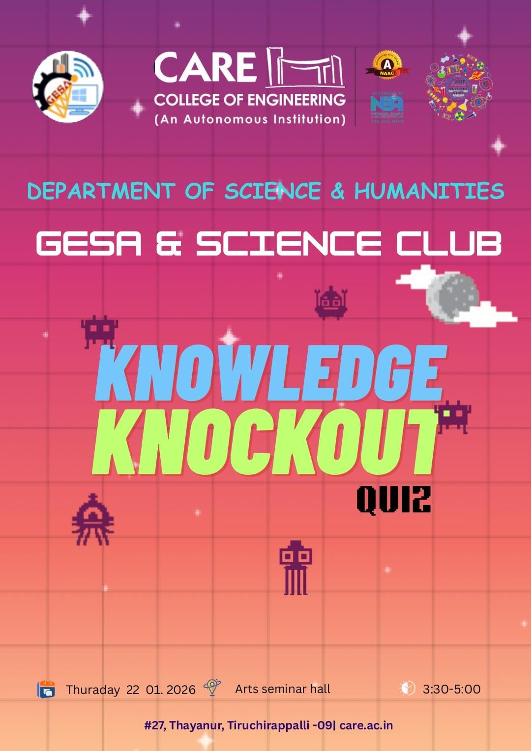GESA and Science Club of Department of Science and Humanities organized a “KNOWLEDGE KNOCKOUT QUIZ” on 22 January 2026 at 3.30 pm in Arts Seminar Hall. Around 100 first year students participated in this event.Students enjoyed and appreciated this event.