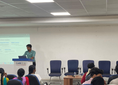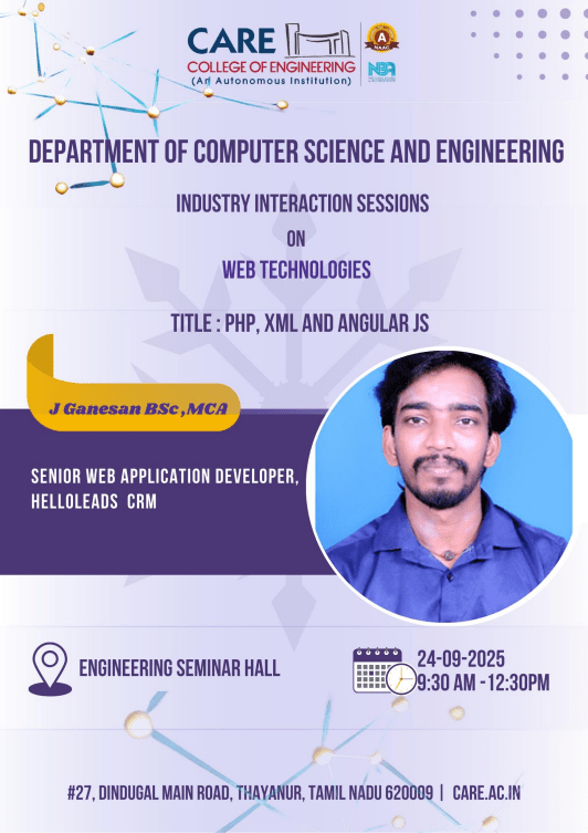 The Department of Computer Science and Engineering, CARE College of Engineering (Autonomous), organized an Industry-Connected Training Session for the V semester course CCS375 – Web Technologies on 24 September 2025 (9:30 AM – 12:30 PM). The session was conducted in association with Hello Leads CRM, Tiruchirappalli, as part of the industry-supported initiative identified during the DAC meeting.