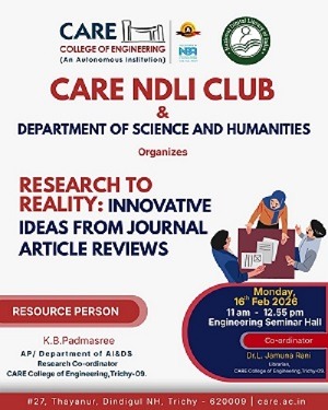 The CARE NDLI Club, in association with the Department of Science and Humanities, organized the presentation competition titled “Research to Reality: Innovative Ideas from Journal Article Reviews” on 16 February 2026 from 11:00 a.m. to 1:00 p.m. at the Engineering Seminar Hall. The event saw enthusiastic participation from around 51 students. The participants presented on a variety of contemporary topics, showcasing their creativity, innovation, research orientation, and presentation abilities. The topics included: