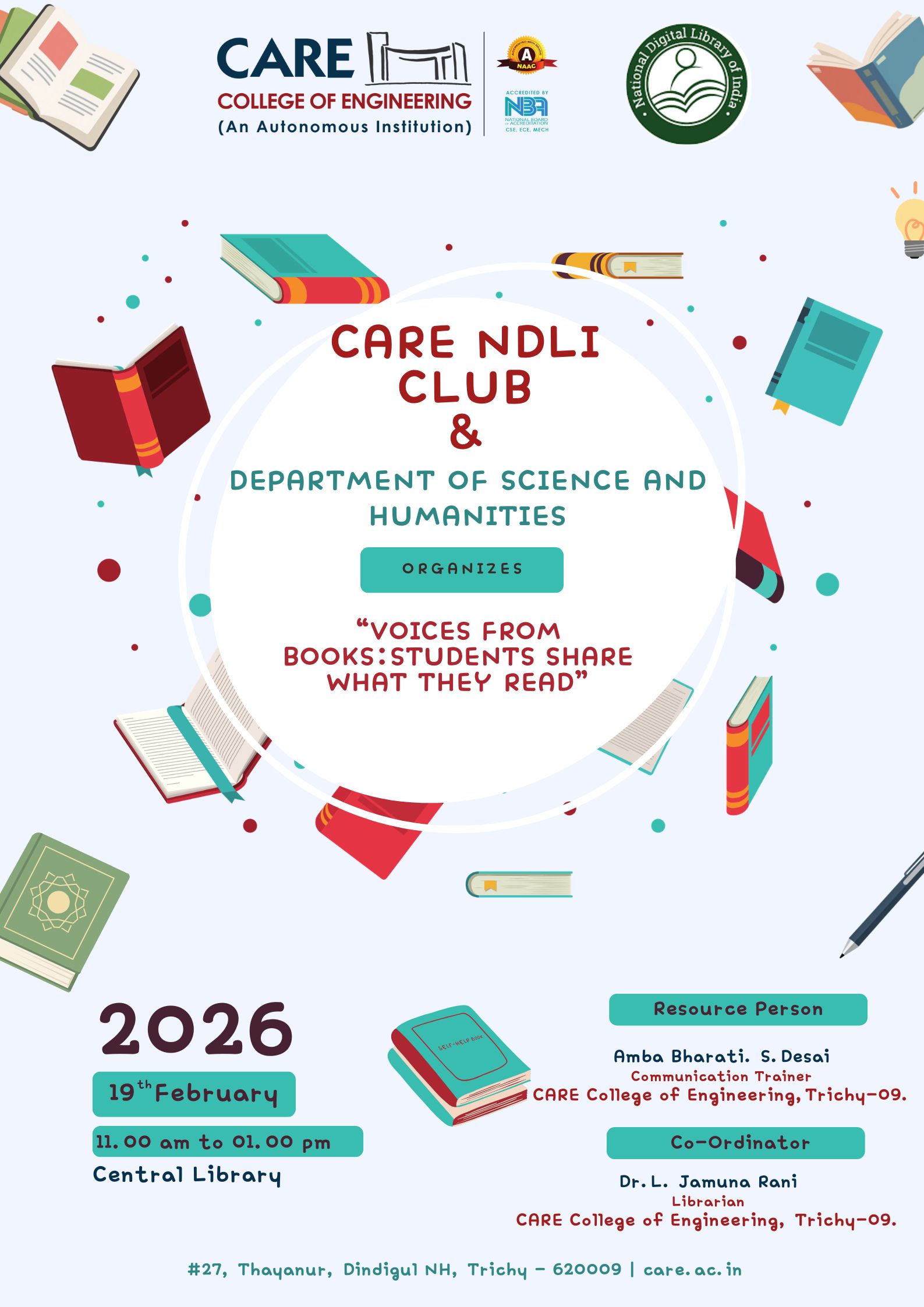The CARE NDLI Club, in collaboration with the Department of Science and Humanities, successfully organized a Book Review competition titled “Voices from Books: Students Share What They Read” on 19 February 2026, from 11:00 a.m. to 1:00 p.m., at the Central Library. The programme witnessed active and enthusiastic participation from nearly 120 students.