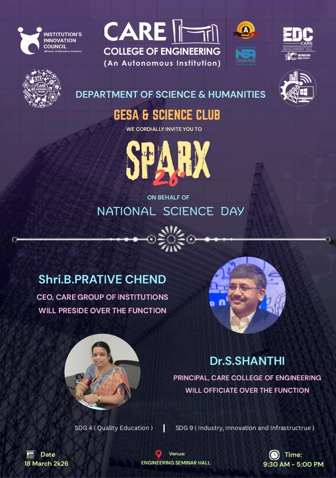 The Department of Science and Humanities, along with GESA & Science Club, organized SPARX 2K26 on 18 March 2026 at CARE College of Engineering. The event is conducted every year on National Science Day to encourage scientific thinking and innovation among students.