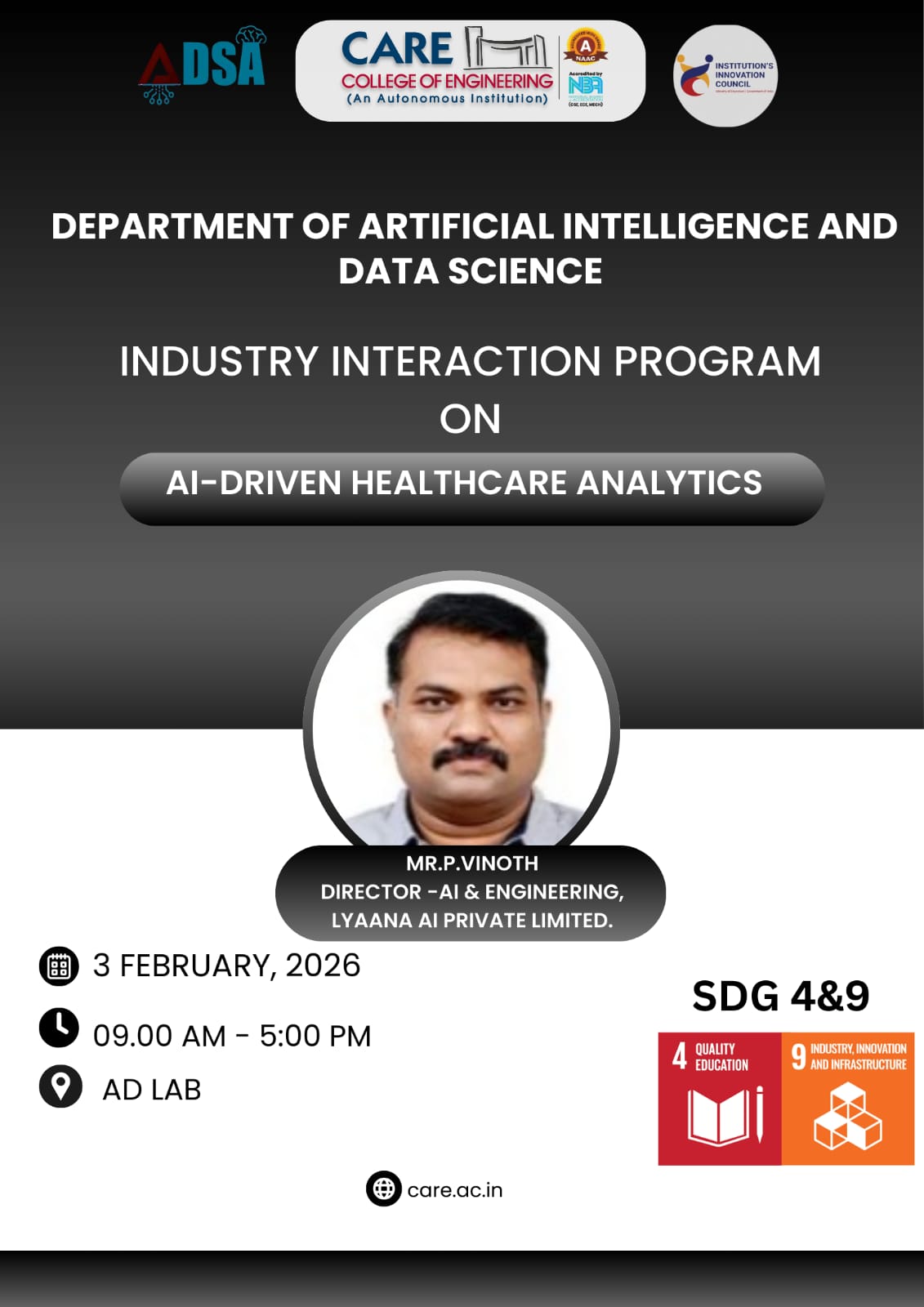 The CARE Institution’s Innovation Council (CARE-IIC) is pleased to announce CARE HACK’26, a National Level 24-Hour AI Hackathon, to be held at CARE College of Engineering, Tiruchirappalli. CARE HACK’26 aims to foster innovation, critical thinking, and collaborative problem-solving among students by addressing real-world challenges using emerging technologies. This hackathon provides a dynamic platform for young...Read More