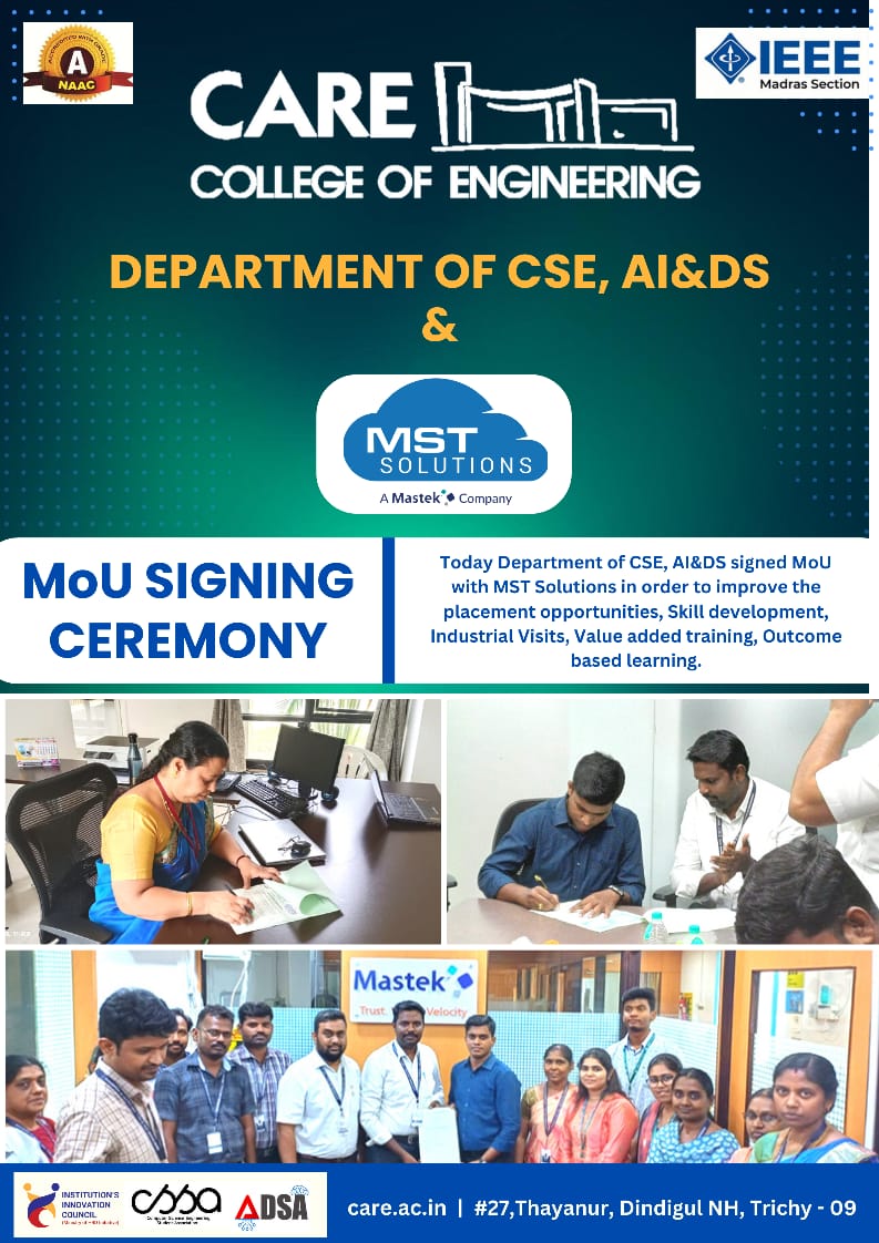 Department of CSE and AIDS have signed MoU with MST Solutions,Trichy, on 15/09/2023 (12 pm) for our CSE and AIDS students. The scope of this MoU is for skill development, internship, placement training, industrial visit and to conduct value added courses for the students.