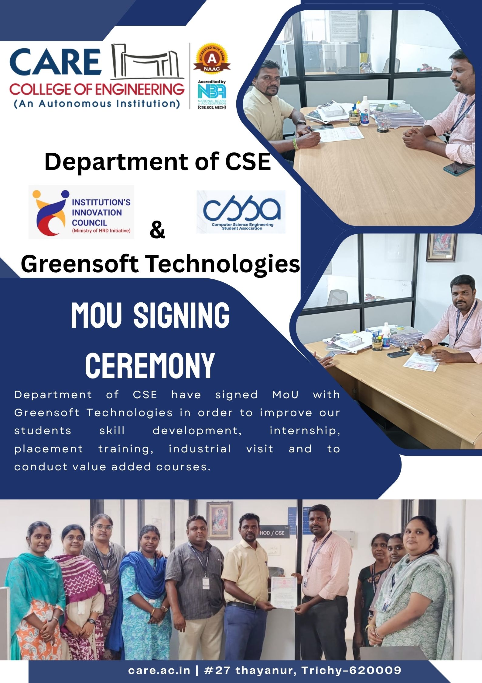 Department of CSE have signed MoU with Greensoft Technologies, Chennai, on 10/05/2025 for our students. The scope of this MoU is for skill development, internship, placement training, industrial visit and to conduct value added courses for the students.