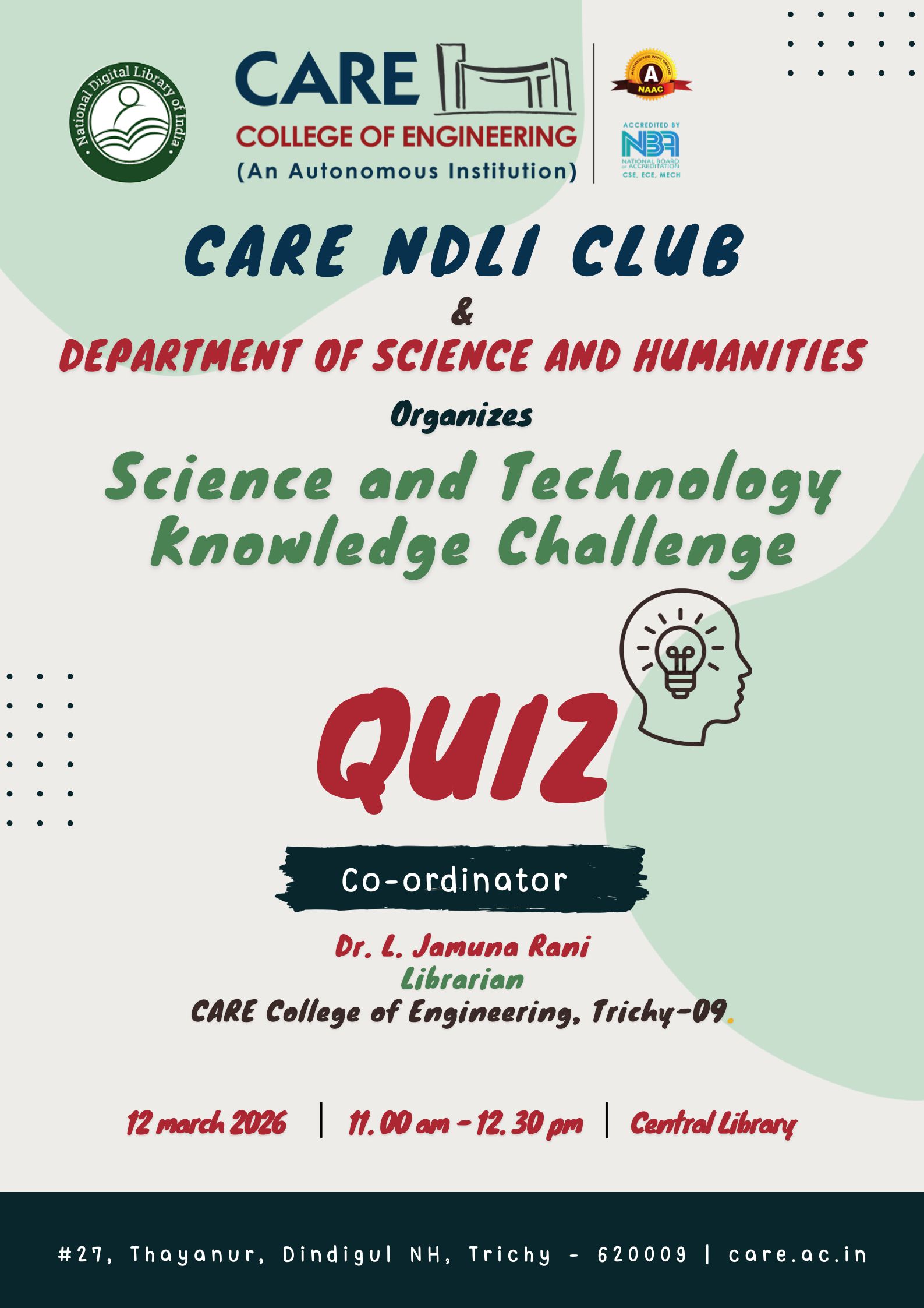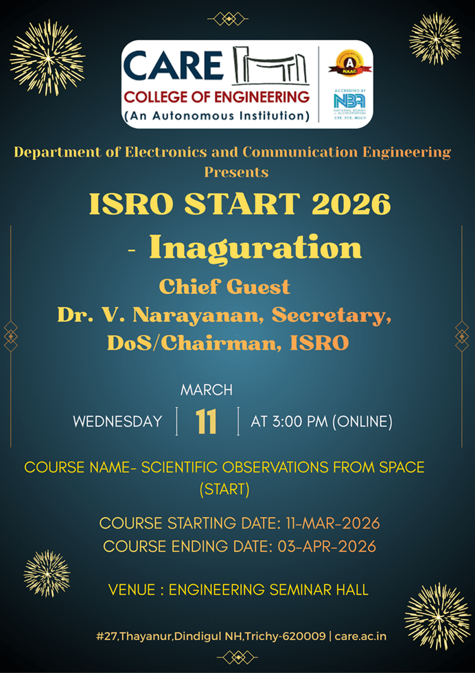 The Department of Electronics and Communication Engineering is pleased to conduct the ISRO Online Programme – START 2026 for the III and IV Year ECE students from March 11, 2026 to April 3, 2026. This prestigious national-level programme brings together eminent scientists from ISRO to address students on various aspects of space science and technology, providing them with valuable exposure to advanced scientific knowledge and […]