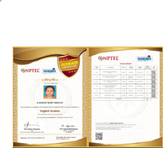 Mrs. Shirley Mary Vanitha A, AP / English has received the ‘Swayam – NPTEL DOMAIN Certification in English Studies during the period of August – October 2025.