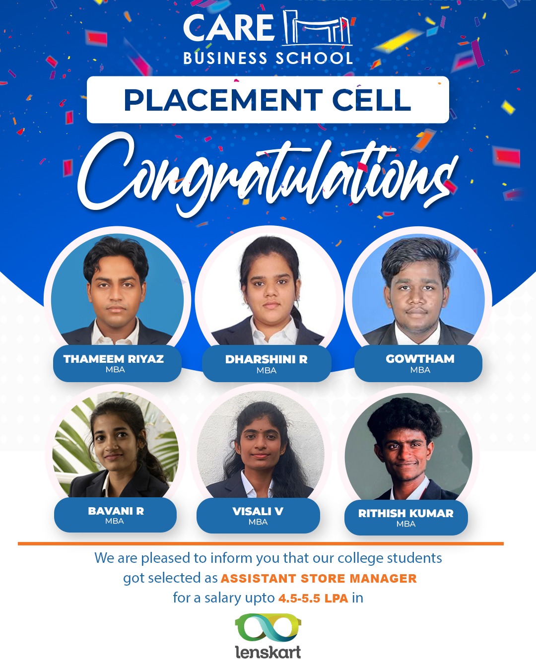We are happy to announce that 6 of our Final MBA students have been placed at Lenskart.com as Assistant Store Manager with a CTC of 4.5 to 5.5 Lakhs per annum.